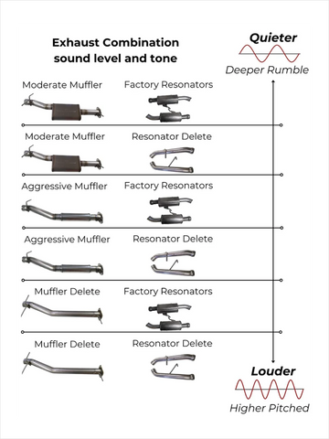 Our Ram 1500 exhaust systems come in three volumes, moderate, which has a deep rumble and sounds like a factory-performance exhaust, Aggressive, which is higher pitched and 20% louder than the moderate, and very aggressive which is a muffler delete straight pipe.